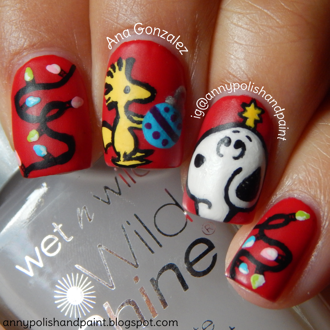 I first put on a coat of my diy glue peel-off base coat, and then I did 2 coats of Seche "Adorned" on each nail. Before I began to paint the characters and lights, I put 1 coat of matte top coat. That just makes it easier to be able to erase your work without ruining your base color, and it's a better surface to work on. Once dried, I painted on the strings of christmas lights on my pointer and pinky. (All the lights, details and characters were done with acrylic paint and a brush.) Then, I moved on to sketching out the characters' shape, first Snoopy and then Woodstock. I started filling in the shapes and perfecting the outlines, as well as adding their faces and other details they each had. I think Woodstock came out better than Snoopy, and I thought it would be the other way around. Lol! I stretched out Snoopy's face (vertically) way too much, other than that, I'm happy with how it all turned out. Oh, and to finish I applied top coat of course.I know that it might be a bit difficult to do the design because it's more intricate, but I tried explaining it as best as I could. I know it'd be better if you could see step-by-step, and I'm sorry I can't show you. But I hope the steps can help those who would like to try out the design for themselves.